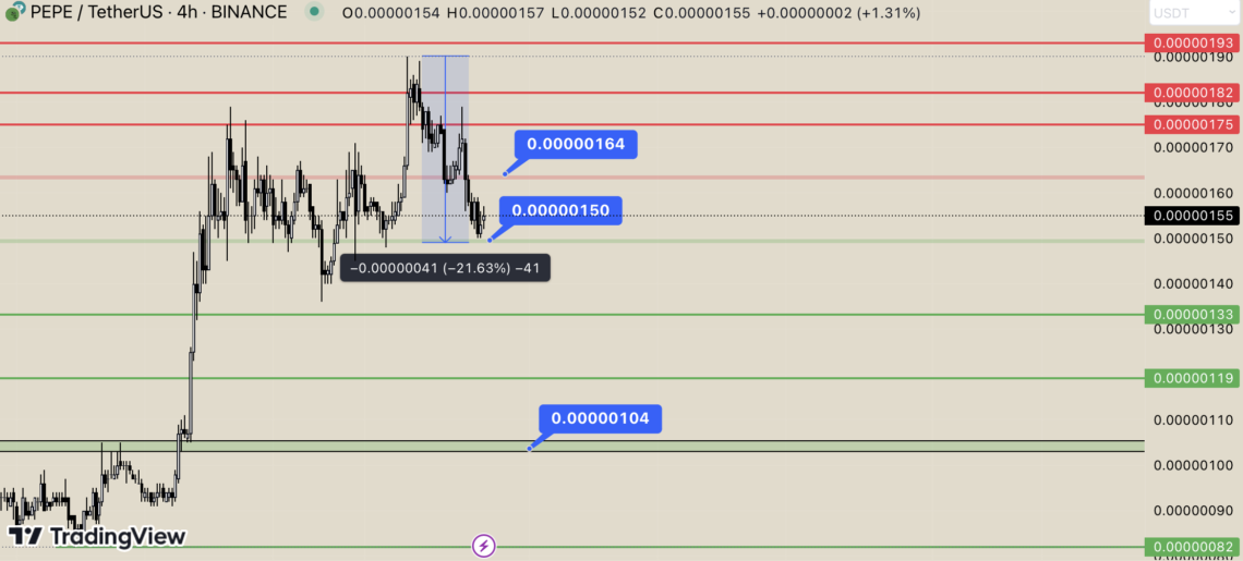 Düşüş eğiliminin devam etmesi, PEPE’deki satış baskısını derinleştirebilir. Piyasa düşüşünde çoklukla çakılan memecoin’ler, PEPE ismine tehlike yaratmaya devam ediyor. PEPE için alıcıların rol oynayabileceği fiyatlar sırasıyla 0,00000150 – 0,00000133 – 0,00000119 – 0,00000104 ve 0,00000082 dolardır.